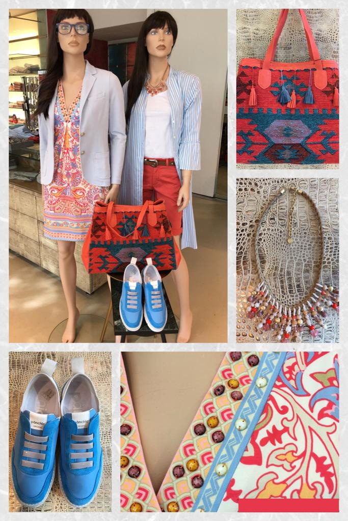 Kleid Hale Bob 379,- Bluse Spoon 249,- Hose Spoon 249,- Halskette Lizas 23,-. Sneakers Panchic 169,- Schal Ottotredici 159,-